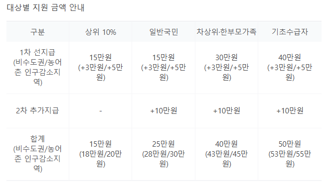 지급 금액은 차등제로 운영돼, 일반 국민에게는 1인당 15만 원, 차상위 계층과 한부모 가정에는 30만 원, 기초생활보장 수급자에게는 1인당 40만 원이 지급됐다.